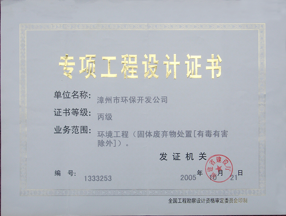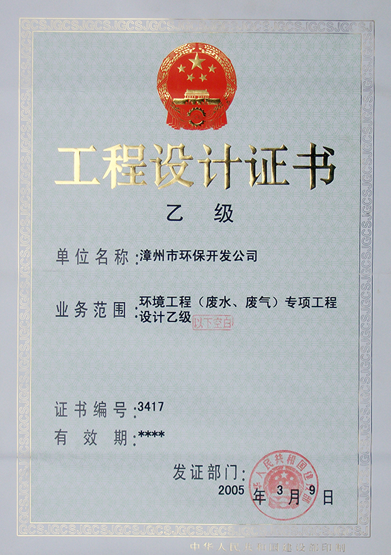 1、環(huán)境工程(廢水、廢氣)專項工程設計乙級,證書編號:3417;